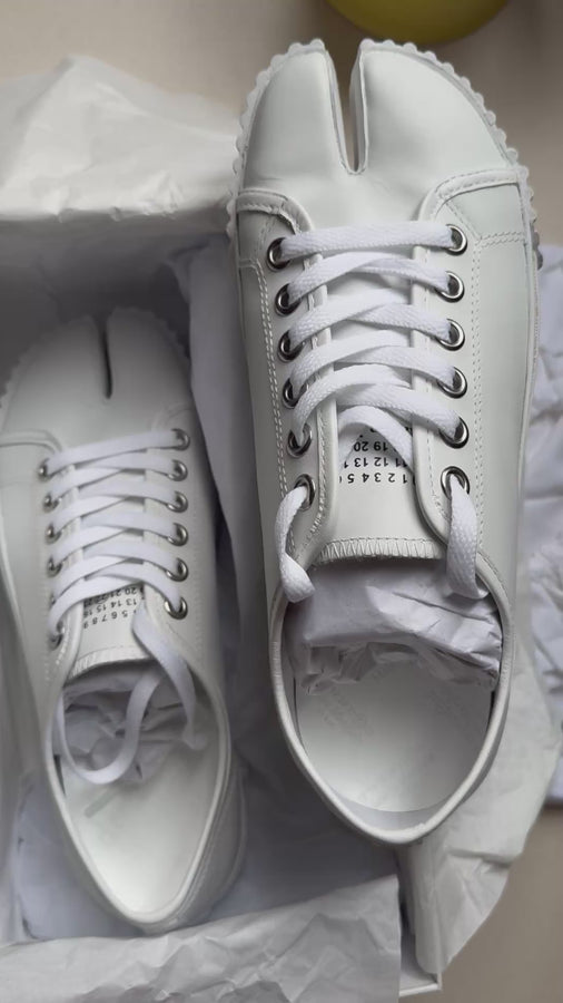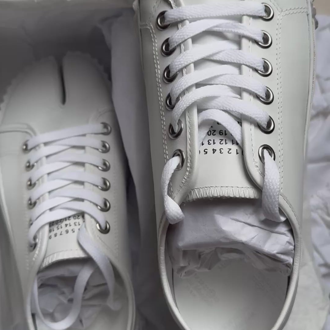 En cuero, las zapatillas tienen una suela con tacos en la parte delantera y un logotipo numérico en la lengüeta. Cuentan con la punta dividida Tabi, inspirada en el calcetín tradicional japonés del siglo XV con el mismo nombre, lanzado para la colección de debut de la Maison en 1989. Captura el espíritu vanguardista e insubordinado de la Maison y existe como un clásico patrimonial, continuamente explorado a través de cada colección.